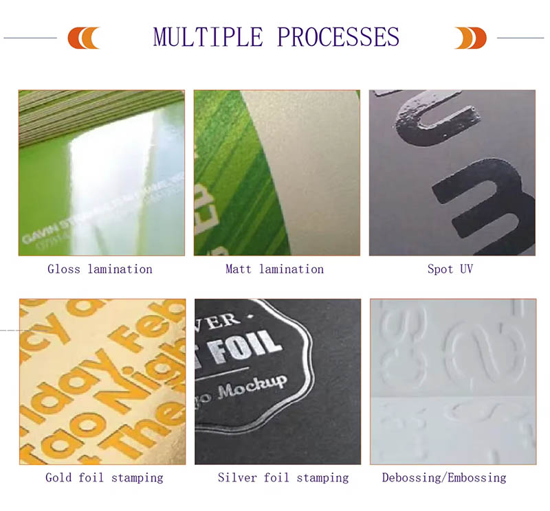 | Surface finishing | Varnishing, Glossy lamination, Matt lamination, Gold/Silver hot stamping, Embossing, UV coating, foil stamping, flocking, hologram effect…. |