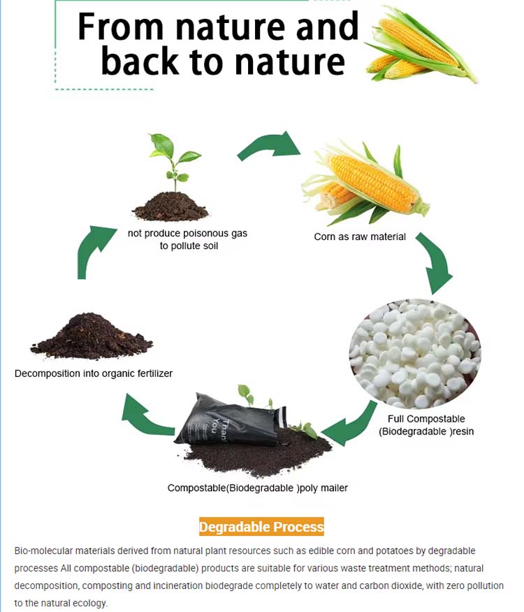 | Advantages | 1) Bag material: We can produce recyclable packaging and biodegradable packaging using different materials. The biodegradable bag can be completely degraded into carbon dioxide and water without causing any pollution to the environment. The biodegradable PLA bag has a wheaty scent. |